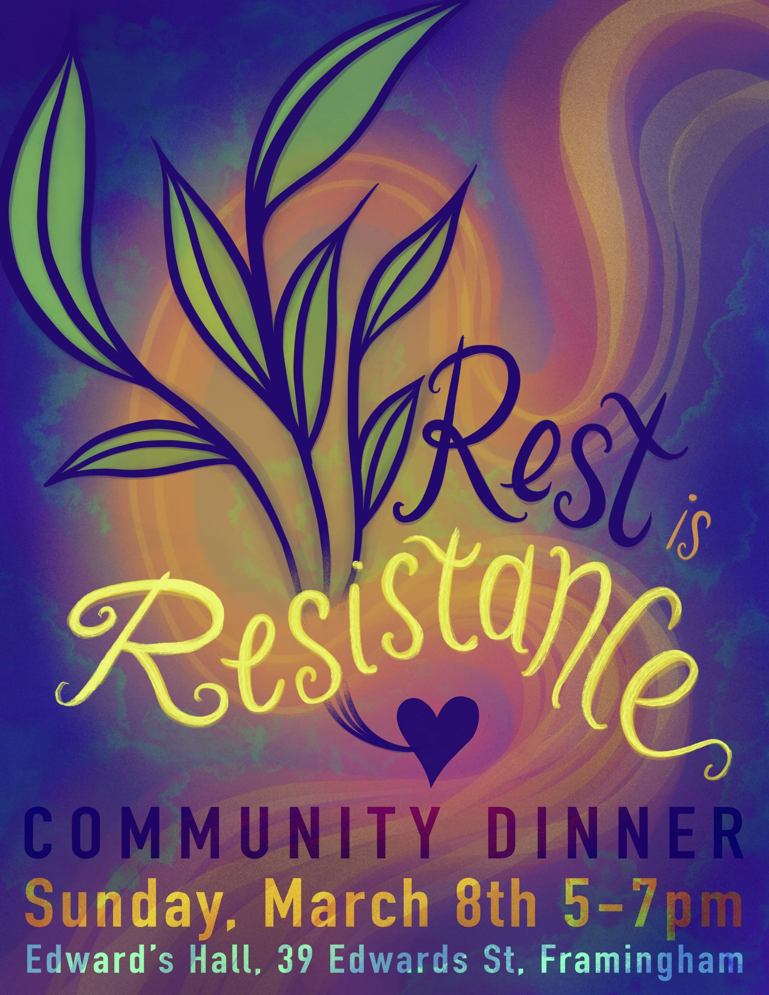 Commissioned to design an invitational flyer for local community activists to come together and share a hearty meal. The theme “Rest is Resistance” was pitched by me before beginning the design process.